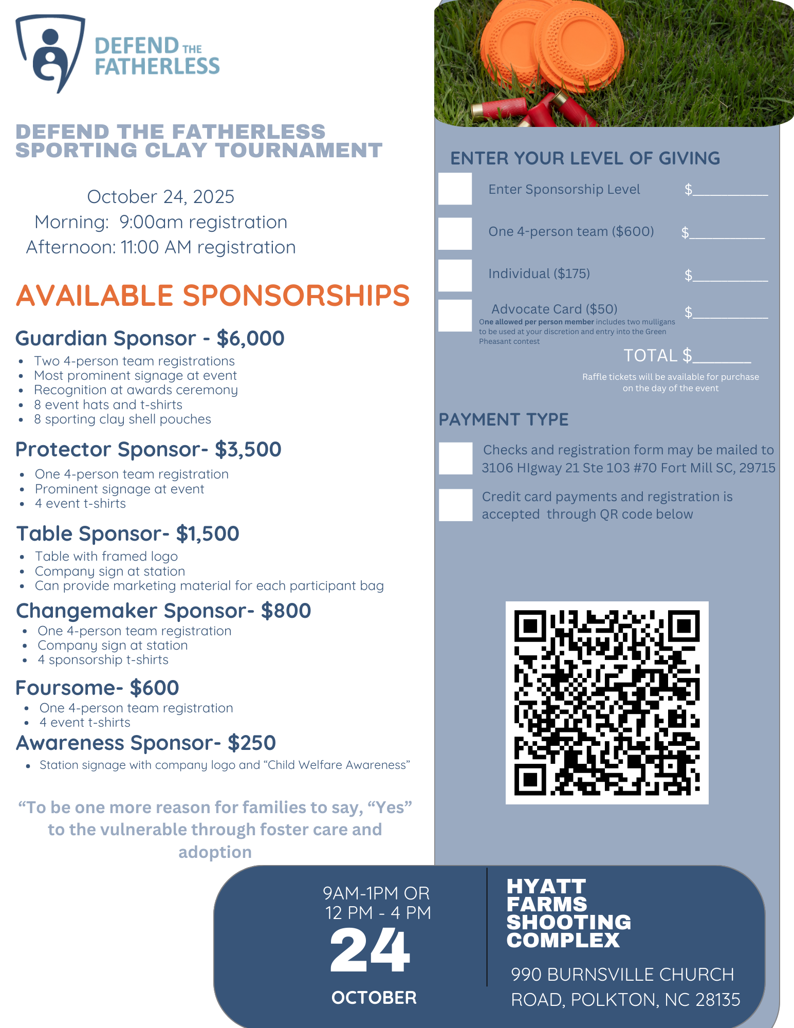 Get ready to aim high for a great cause! We’re thrilled to invite you to our 2nd Annual Clay Shoot, benefiting Defend the Fatherless — supporting foster, adoptive, and kinship families in our community.
